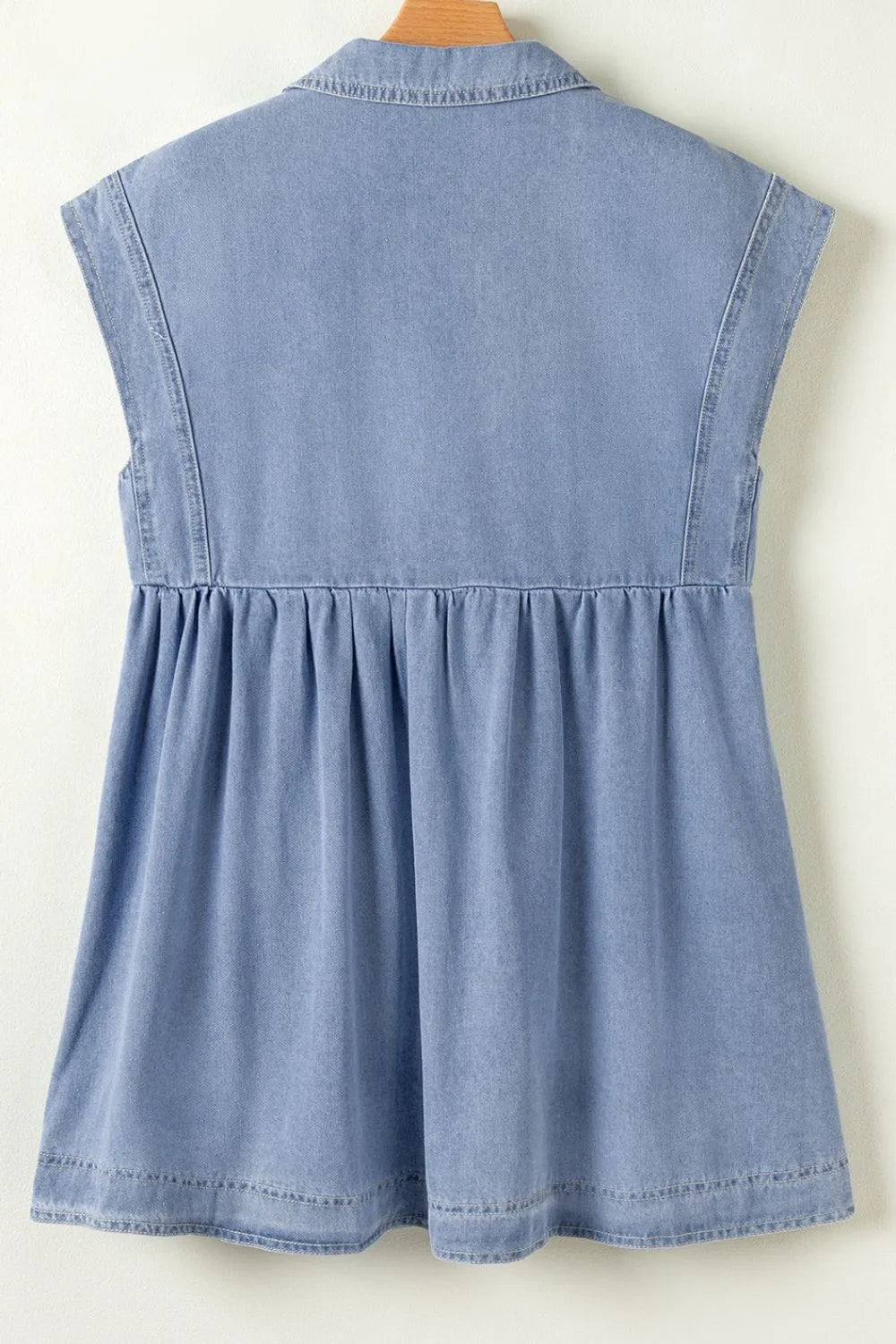 Stay cool and cute in this light wash denim babydoll mini dress —perfect for effortless summer style! The collared V-neck and short cap sleeves give it a classic shirt-dress vibe, while the gathered empire waist and flowy flared skirt create a flattering, forgiving babydoll silhouette. Made from soft, lightweight denim, it's ideal for casual outings, brunch, vacations, or layering with sneakers or sandals.
